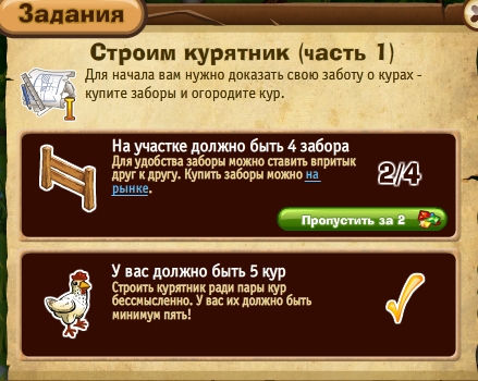 После выполнения первой части вы получите задание "Обустраиваем двор", а также 2 часть задания "Строим курятник"