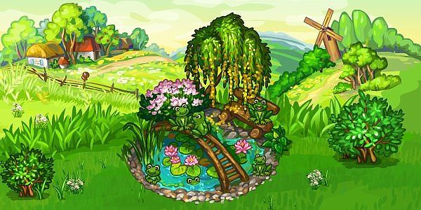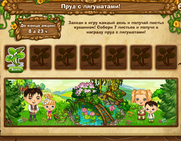 Заходите в игру каждый день и получайте листья кувшинок. Соберите 7 листьев и получите в награду пруд с лягушатами, будет давать 3 энергии, 160 опыта раз в 21 час и иногда элементы набора любителя цветов.