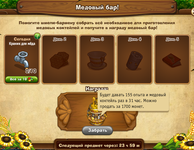 Медовый бар: будет давать 155 опыта и медовый коктейль раз в 31 час. Медовый коктейль восстановит 4 энергии.