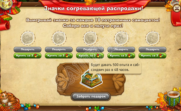 Выигрывайте значки за каждые 10 потраченных самоцветов. Соберите все и получите Сэндвич-бар, который будет давать 500 опыта и саб-сэндвич (восстановит 6 энергии) раз в 48 часов.