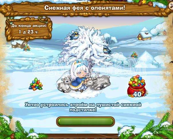 В игре новая акция "Снежная фея с оленятами"Раз в 24 часа будет давать 4 энергии и 250 опыта. Иногда будет давать крошку-олененка (каждую кормёжку будет давать 45 монет и 15 опыта).