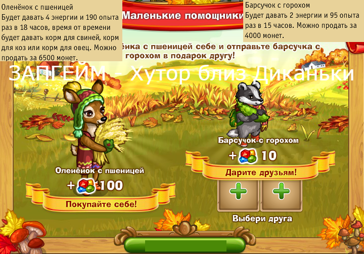 Оленёнок с пшеницей - 4 энергии и 190 опыта раз в 18 часов, время от времени будет давать корм для свиней, корм для коз или корм для овец. Можно продать за 6500 монет.