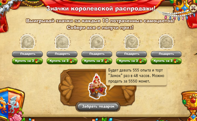 - Награда за первый комплект собранных значков: Королевский стол, который будет давать 555 опыта и торт "Замок" раз в 48 часов. Можно продать за 5550 монет.