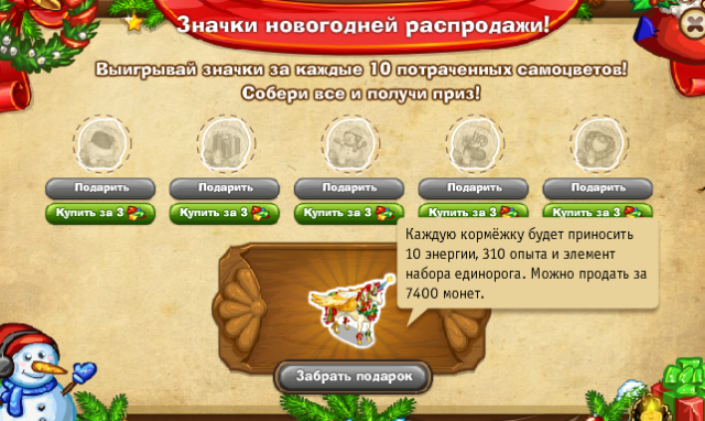 Награда за первый комплект собранных значков: Новогодний единорог, который каждую кормёжку будет приносить 10 энергии, 310 опыта и элемент набора единорога. Можно продать за 7400 монет.