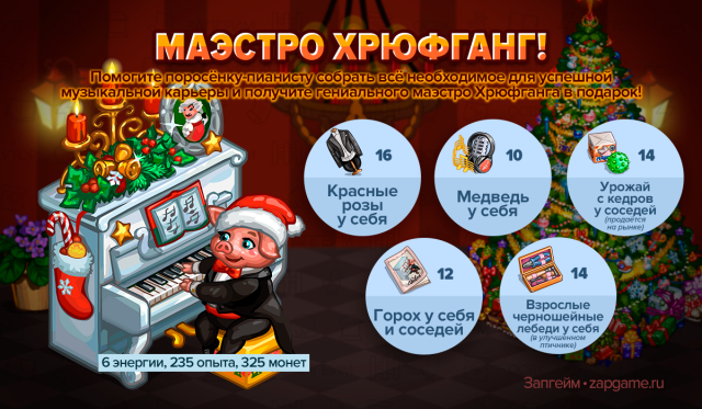 Маэстро Хрюфганг — Будет давать 6 энергии, 235 опыта, 325 монет, а также один из элементов академического набора или набора благодарного слушателя раз в 25 часов. Время от времени будет приносить золотую или обычную грампластинку