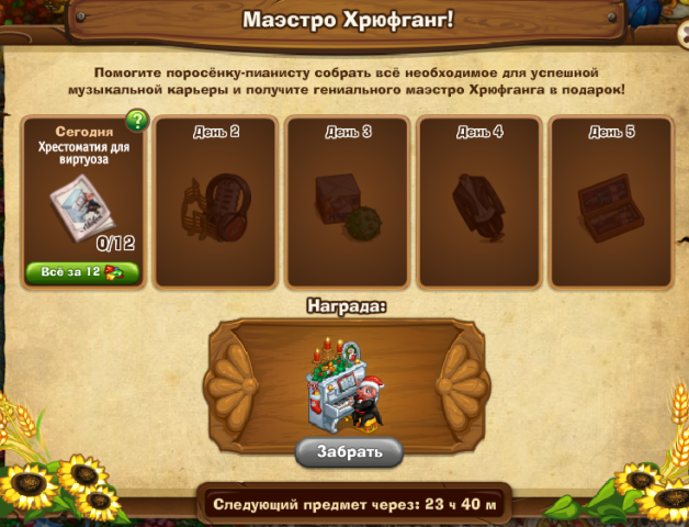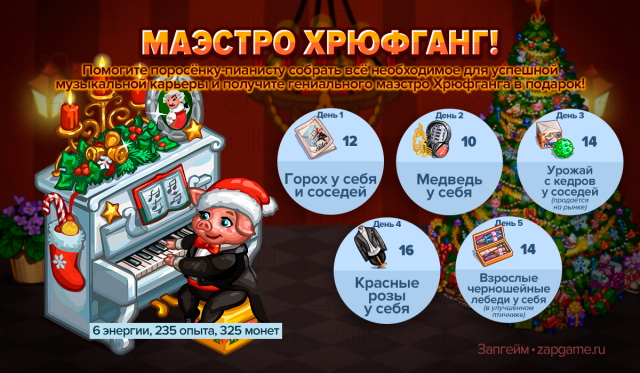 Награда: Маэстро Хрюфганг — Будет давать 6 энергии, 235 опыта, 325 монет, а также один из элементов академического набора или набора благодарного слушателя раз в 25 часов. Время от времени будет приносить золотую или обычную грампластинку.