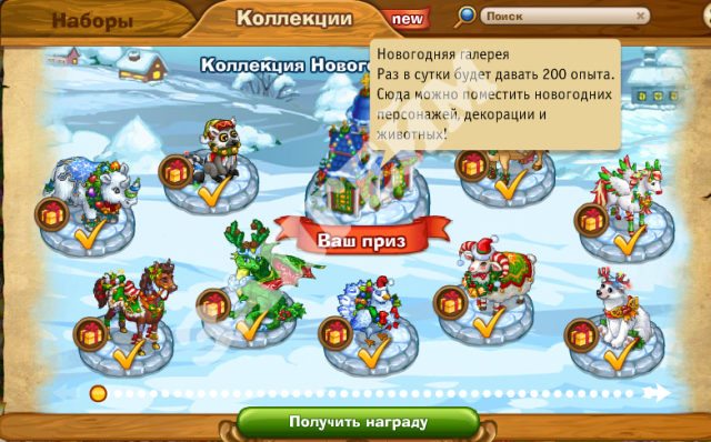 Соберите всех животных из коллекции и получите в подарок новогоднюю галерею, которая раз в сутки будет давать 200 опыта. В неё можно поместить новогодних персонажей, декорации и животных. Новогодняя галерея расширяется до 210 мест.