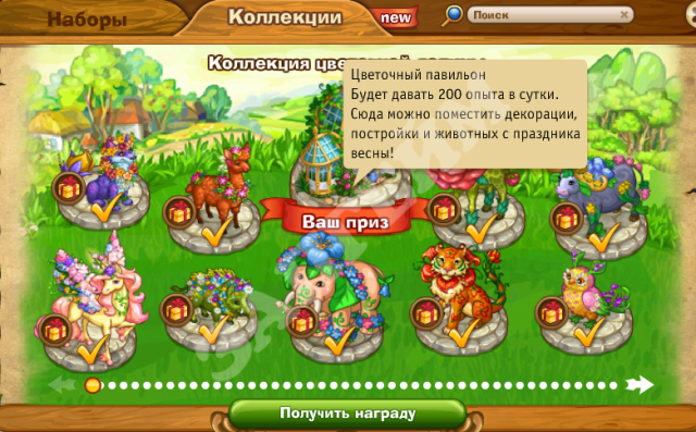 Собери всех животных из коллекции и получи в подарок Цветочный павильон, который будет давать 200 опыта в сутки. В него можно поместить декорации, постройки и животных с праздника весны. Цветочный павильон расширяется до 210 мест.