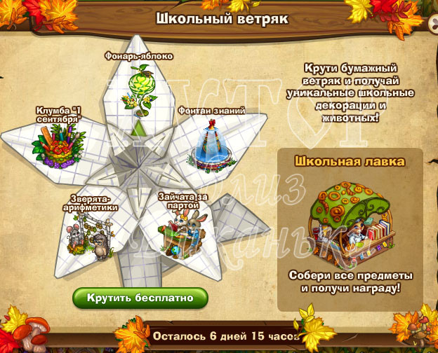 Школьная лавка: 250 опыта и 4 энергии раз в 36 часовФонарь-яблоко: декор, можно продать за 1000 монетФонтан знаний: 25 опыта раз в 10 часов. Можно продать за 2000 монет.Зайчата за партой: 125 опыта раз 10 часов. Можно продать за 2500 монетЗверята-арифметики: 2 энергии и 35 опыта раз 24 часа. Можно продать за 3000 монетКлумба "1 сентября": декор, можно продать за 1500 монет