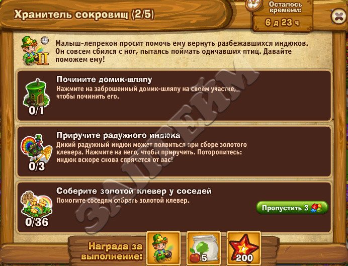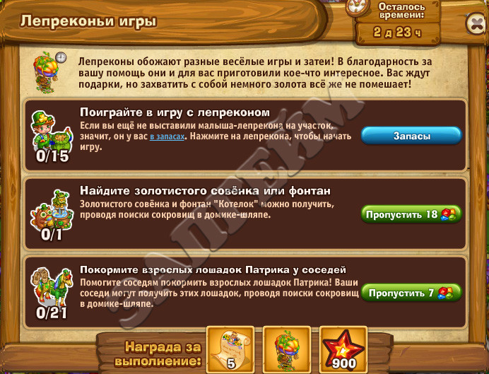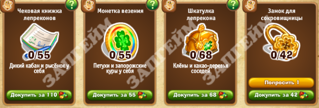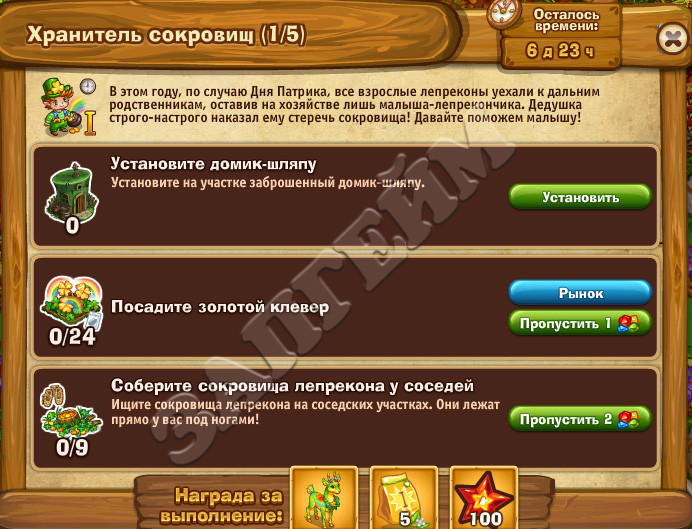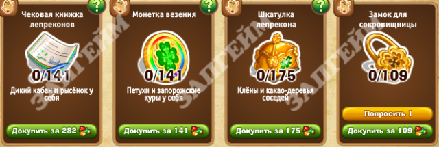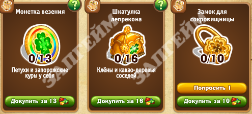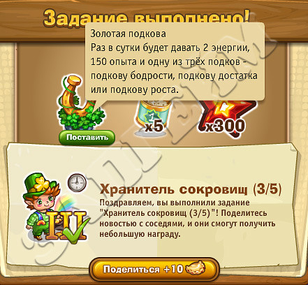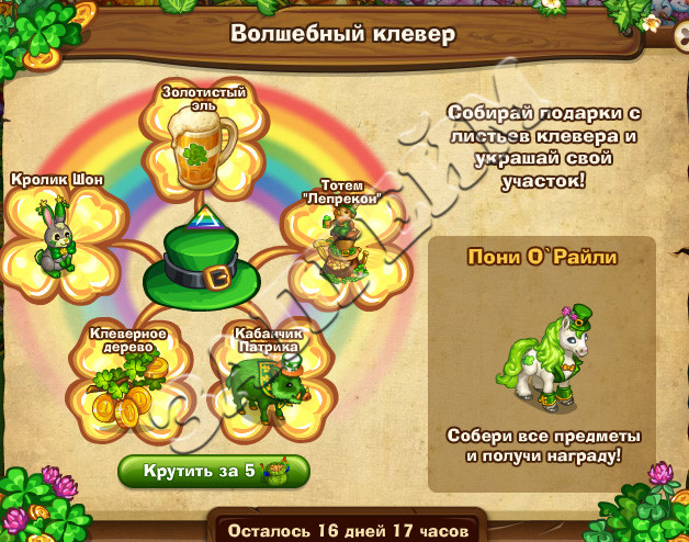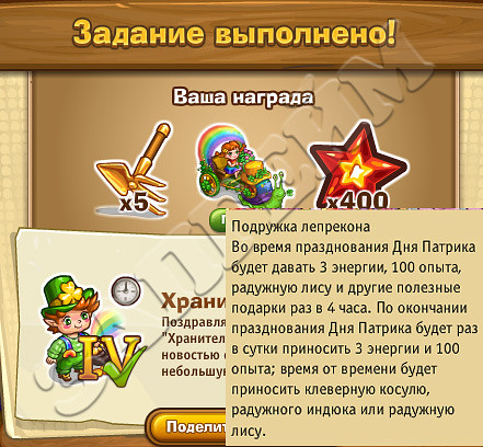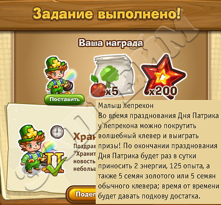 | Раз в сутки будет давать 4 энергии и 210 опыта. Время от времени будет приносить сундук лепрекона. | Во время празднования Дня Патрика будет давать 3 энергии, 100 опыта, радужную лису и другие полезные подарки раз в 4 часа. По окончании празднования Дня Патрика будет раз в сутки приносить 3 энергии и 100 опыта; время от времени будет приносить клеверную косулю, радужного индюка или радужную лису. | Во время празднования Дня Патрика у лепрекона можно покрутить волшебную ромашку и выиграть призы! По окончании празднования Дня Патрика будет раз в сутки приносить 2 энергии, 125 опыта, а также 5 семян золотого или 5 семян обычного клевера; время от времени будет давать подкову достатка. |