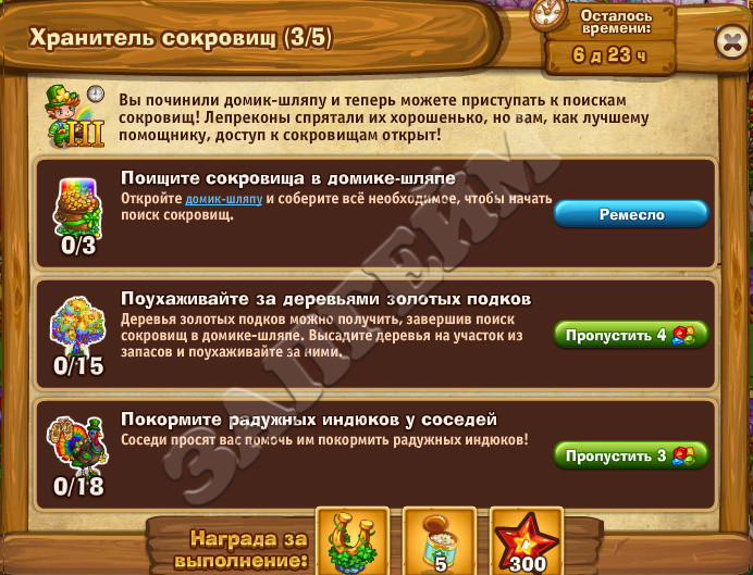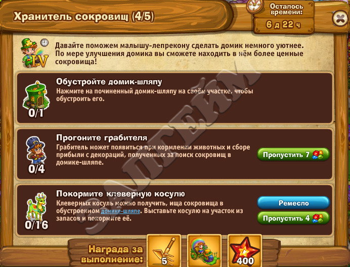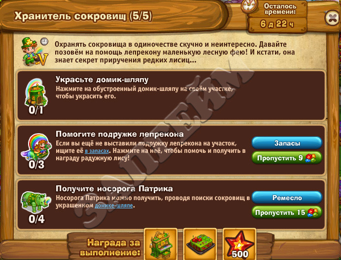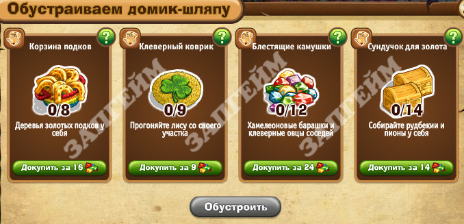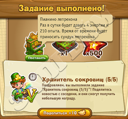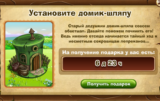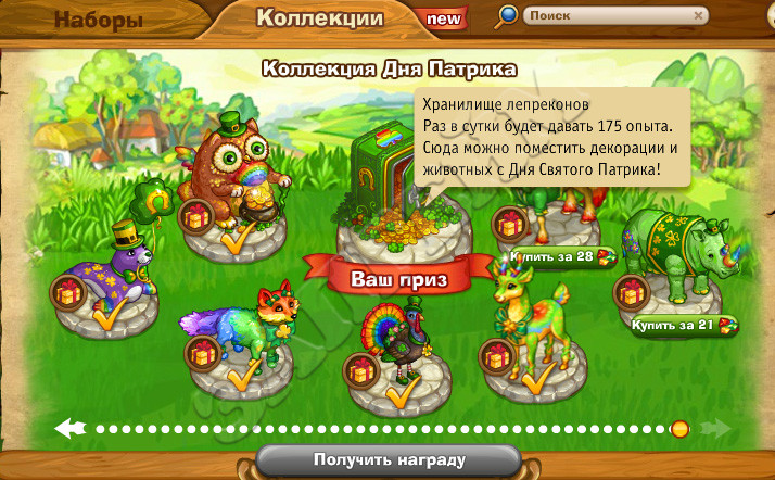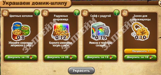 | Украшенный домик-шляпа раз в сутки будет давать 200 опыта и эль. Время от времени будет приносить семена золотого клевера или саженец дерева золотых подков. | Награда за сбор коллекции Дня Патрика. Раз в сутки будет давать 175 опыта.