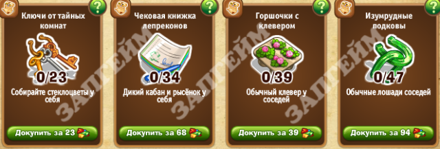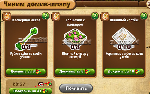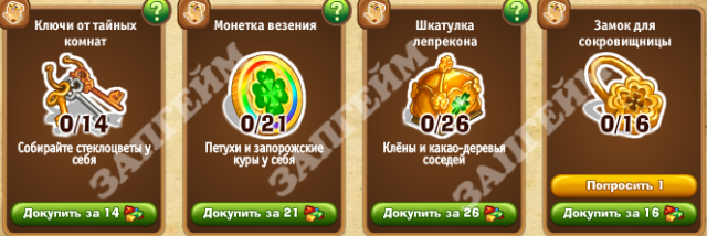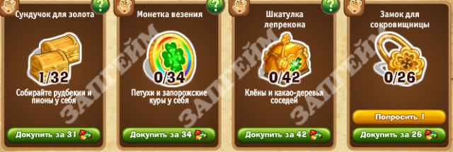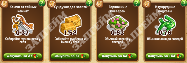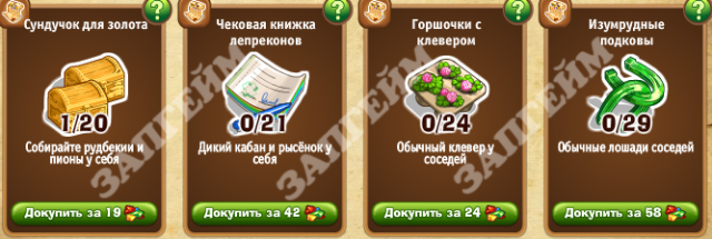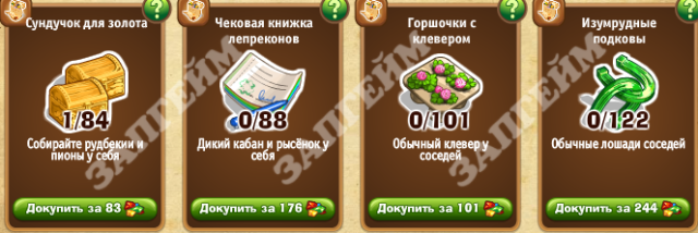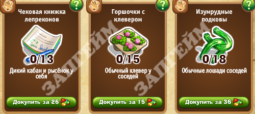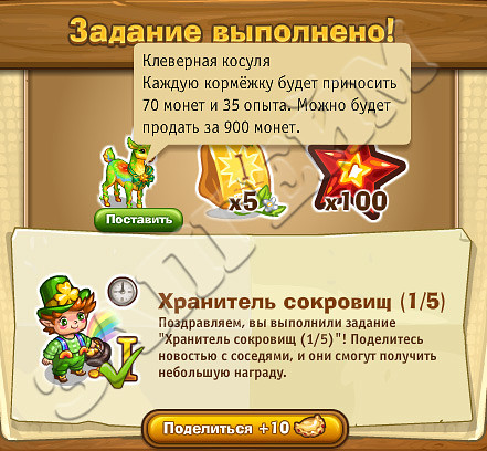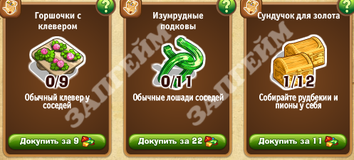 | Будет давать 3 энергии, 105 опыта и чистейшую воду раз в 22 часа. | Будут давать 2 энергии, 500 монет и 5 семян золотого клевера раз в 11 часов. | Будет давать 180 монет и 33 опыта раз в 5 часов. |