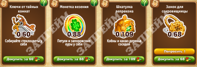 | Раз в 24 часа будет приносить 4 энергии и 165 опыта; время от времени будет давать подкову достатка, подкову бодрости или подкову роста. | Раз в 14 часов будет приносить 120 опыта и 8 дерева; время от времени будет давать эль. | Раз в 9 часов будет приносить 90 опыта и 12 еды. |