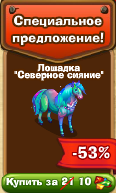 | Лошадка "Северное сияние" - каждую кормёжку будет приносить 3 энергии и 40 опыта. Можно продать за 2100 монет. |