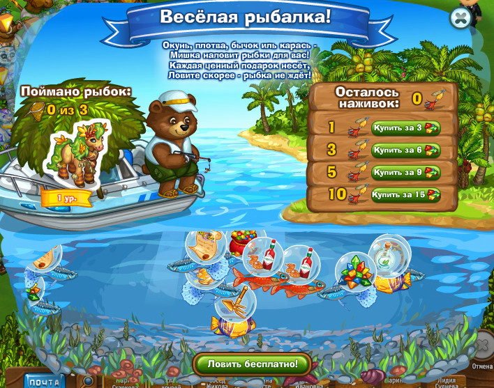 1 ур. (3 рыбки): Осенний пони (каждую кормежку будет приносить 2 энергии и 135 опыта. Можно продать за 1800 монет). 2 ур. (5 рыбок): Ночной волк (каждую кормежку будет приносить 2 энергии и 95 опыта. Можно продать за 1200 монет).3 ур. (10 рыбок): Зайчиковая лошадка (каждую кормёжку будет приносить 3 энергии и 65 опыта. Можно продать за 1400 монет).4 ур. (15 рыбок): Лисичка-путешественница (раз в сутки приносит 3 энергии и 100 опыта. Время от времени будет давать элементы набора морских сувениров или мавританского набора).5 ур. (20 рыбок): Небесная лошадка (когда вырастет, будет каждую кормёжку - приносить 4 энергии и 25 опыта. Можно продать за 1900 монет).6 ур. (30 рыбок): Цветочный енот (каждую кормежку будет приносить 4 энергии, 155 опыта и элементы набора травника).7 ур. (40 рыбок): Лошадка "Весна" (каждую кормёжку будет приносить 5 энергии и 75 опыта. Можно продать за 4000 монет).8 ур. (50 рыбок): Орел-спасатель (каждую кормёжку будет давать 5 энергии, 145 опыта и 5 дерева. Можно продать за 3000 монет).9 ур. (70 рыбок): Медовая лошадка (каждую кормёжку будет приносить 5 энергии и 115 опыта. Время от времени будет давать элементы пчелиного набора. Можно продать за 1900 монет).10 ур. (90 рыбок): Жираф Донован (каждую кормёжку будет приносить 6 энергии и 77 опыта. Можно продать за 70 опыта).11 ур. (110 рыбок): Географическая лошадка (каждую кормежку будет приносить 7 энергии и 125 опыта).12 ур. (140 рыбок): Бык-барон Ангус (каждую кормёжку будет приносить 8 энергии и 160 опыта. Можно продать за 3000 монет).13 ур. (170 рыбок): Мустанг чероки (каждую кормежку будет приносить 9 энергии и 120 опыта).14 ур. (210 рыбок): Детка (каждый сбор прибыли принесет опыт и 14 энергии. Можно продать за 25000 монет).15 ур. (250 рыбок): Морской единорог (каждую кормёжку будет приносить 16 энергии, 250 опыта и элемент набора единорога. Можно продать за 13500 монет).