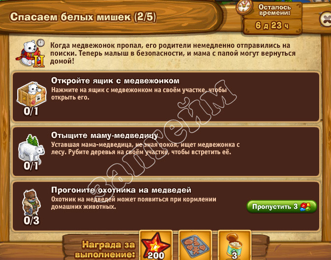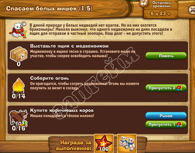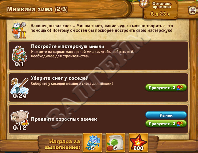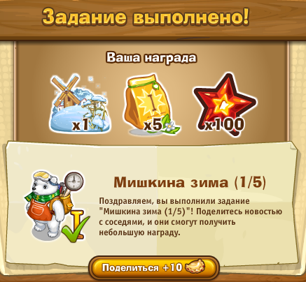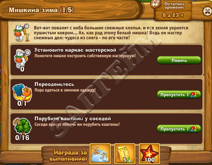 Данное задание игроки могут получить до наступления весны (84 дня). Задание состоит из 5-и основных частей без таймера и 1-ой дополнительной с таймером. После выполнения первой части задания таймер не будет отображаться. Теплая зима (часть 1)